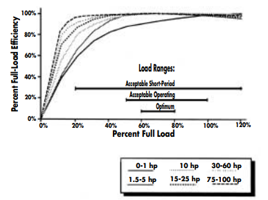 Reasons to Determine Motor LoadingMost electric motors are designed to run at 50% to 100% of rated load. Maximum efficiency isusually near 75% of rated load. Thus, a 10-horsepower (hp) motor has an acceptable load range of 5 to 10 hp; peak efficiency is at 7.5 hp. A motor’s efficiency tends to decrease dramatically belowabout 50% load. However, the range of good efficiency varies with individual motors and tends to extend over a broader range for larger motors, as shown in Figure 1. A motor is considered